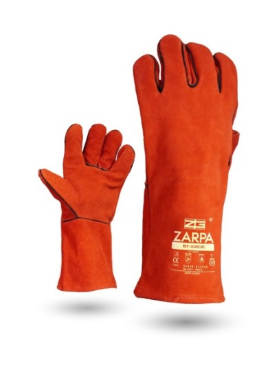 Guante de soldador corto con piel serraje roja de calidad extra. Con costuras reforzadas y forro franela. Resistente al calor y con un excelente comportamiento a la llama. El diseño y su forro interior hace que el guante sea muy confortable. Longitud 36 cm. Grosor 1,3 - 1,4 mm.